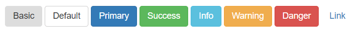 <body> <button type="button" class="btn">Basic</button> <button type="button" class="btn btn-default">Default</button> <button type="button" class="btn btn-primary">Primary</button> <button type="button" class="btn btn-success">Success</button> <button type="button" class="btn btn-info">Info</button> <button type="button" class="btn btn-warning">Warning</button> <button type="button" class="btn btn-danger">Danger</button> <button type="button" class="btn btn-link">Link</button> </body>