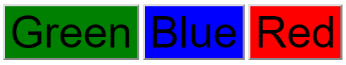 <html> <body> <button type="button" style="background-color: green; font-size: 50px">Green</button> <button type="button" style="background-color: blue; font-size: 50px">Blue</button> <button type="button" style="background-color: red; font-size: 50px">Red</button> </body> </html>