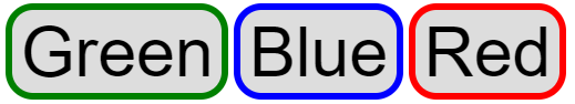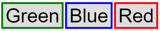 <html> <body> <button type="button" style="border: 5px solid green; font-size: 50px">Green</button> <button type="button" style="border: 5px solid blue; font-size: 50px">Blue</button> <button type="button" style="border: 5px solid red; font-size: 50px">Red</button> </body> </html>