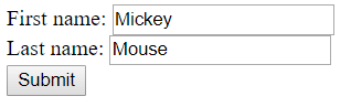 <html> <body> <form action="/action_page.php"> First name: <input type="text" name="FirstName" value="Mickey"><br> Last name: <input type="text" name="LastName" value="Mouse"><br> <button type="submit">Submit</button> </form> </body> </html>
