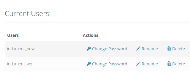 Scroll down to bottom, here you will see Current Users. All MySQL users currently existing on our system will be listed here. One example of user listing is shown below: