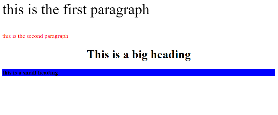 In the above example, I used various styling properties. In the first paragraph, I used the font-size property to change the size of the font to forty pixels. I used the color property to change the color of the second paragraph to red.  Then in the first heading, I used the text-align property to align the heading in the center of the page. In the last heading, I used the background-color property to change the background color of the heading to blue. These are a few properties that could be used to create an attractive web page.